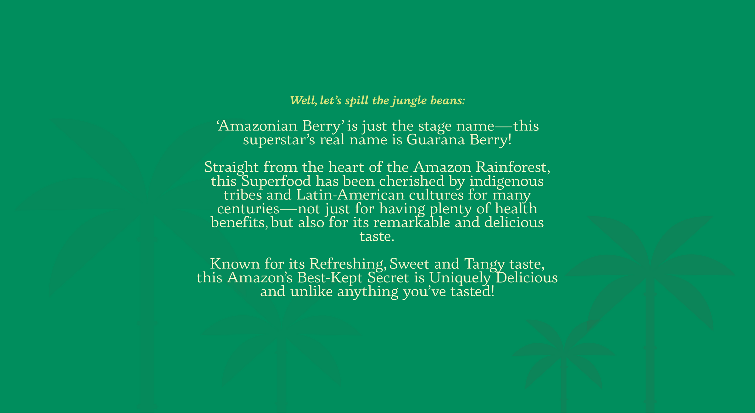 Our Amazonian Superfood Berries are Caffeine-Free and packed with vitamins and antioxidants to support You and your Health, while improving your focus and mood in every sip!